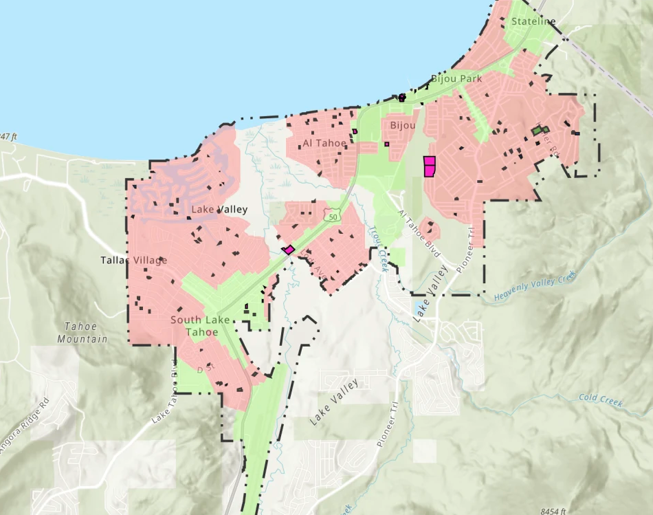 The Tourist Core in South Lake Tahoe accommodates vacation rentals and features a restricted number of single-family residences alongside condo complexes such as Lakeland Village, Sierra Shores, and Zalanta.